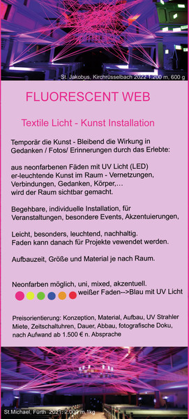 Gebäude, Portraits, Figuren, Schriften, Wörter, Pflanzen, Motive stets in Zusammenhang mit der Stadt Gunzenhausen und seiner Geschichte und Kultur, seiner Menschen und Umgebung in verschiedenen fluoreszierenden Formen und Farben, bunte Schatten werfend, Reflexe bildend und sich im Raum bewegend.