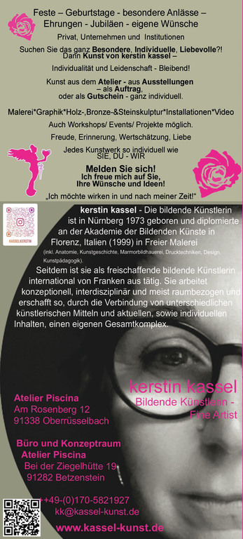 Gerne berate ich Sie, zeige Ihnen nach Absprache Kunstwerke in meinem Atelier und erarbeite mit Ihnen gemeinsam ein Auftrags-Kerstin Kassel-Kunstwerk.